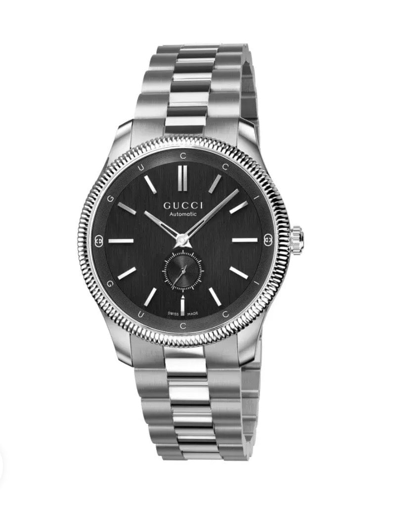 Cassa in acciaio inox da 40 mm, quadrante nero con dettagli Incrocio GG e scritta Gucci, piccolo quadrante dei secondi, bracciale in acciaio inox